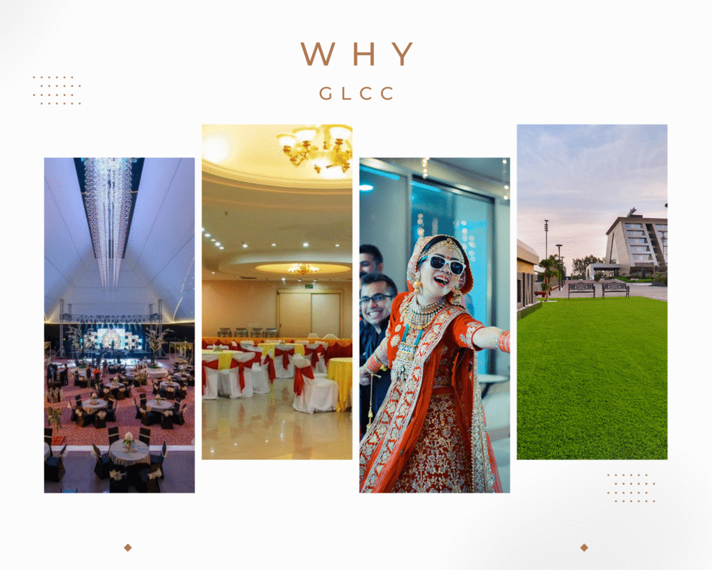 GLCC bridges the gap between choices of generations. Guests of all age groups love GLCC, no matter what! It is easy to be located by guests that offer hassle-free commutes from Airport, or Railway Station. Sprawling lawns with lush green landscapes and halls can comfortably accommodate over 10,000 guests at a time across 3 venues.